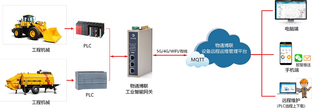 顺利获得long8龙8国际的工业智能网关,连接工程机械设备的控制器、传感器等设备,实时采集设备的位置信息、运行状态(如工作、空闲、故障等)、运行参数(如发动机转速、油压、水温等)、油耗等数据。将采集到的数据传输至设备运维管理平台,平台对数据进行分析和处理。当设备出现故障时,及时发出预警,并顺利获得long8龙8国际设备维护快线进行远程维护,提高维护效率,降低运维成本,实现设备全生命周期数字化管理。