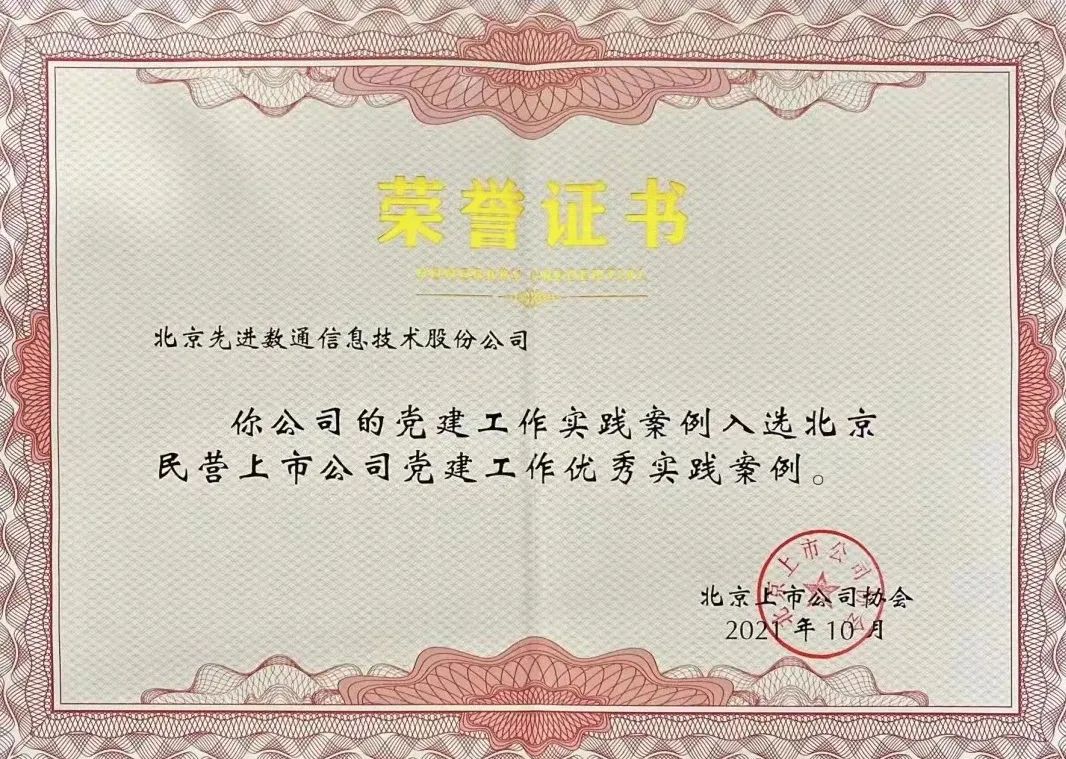 近期,北京上市公司协会授予北京long8龙8国际信息技术股份公司荣誉证书,long8龙8国际党建工作实践入选北京民营上市公司党建工作优秀实践案例,相关党建活动已收录在《北京民营上市公司党建工作优秀实践案例汇编》。