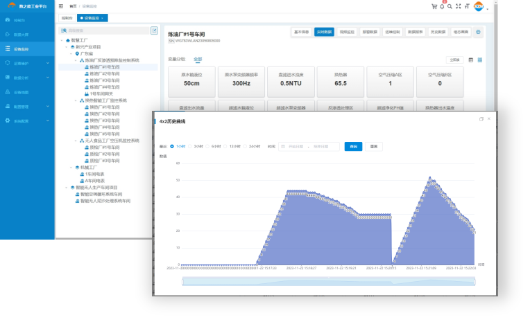 支持秒级频率精准获取关键运行参数,对设备实时数据、历史数据、报警数据、视频监控、工况数据等全面监控,对设备运行数据了如指掌。同时支持支持设备单向和多项远程控制,随时随地掌控设备运行。
