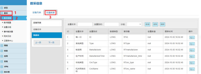 数采配置(设备信息+变量参数)完成后,重启采集程序并生效配置即可在:数采信息---变量数据---设备名称 中看到采集上来的数据。