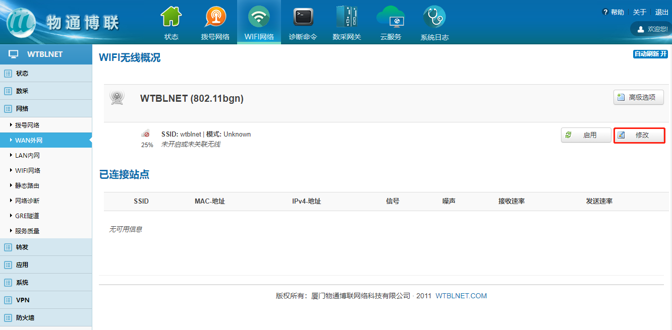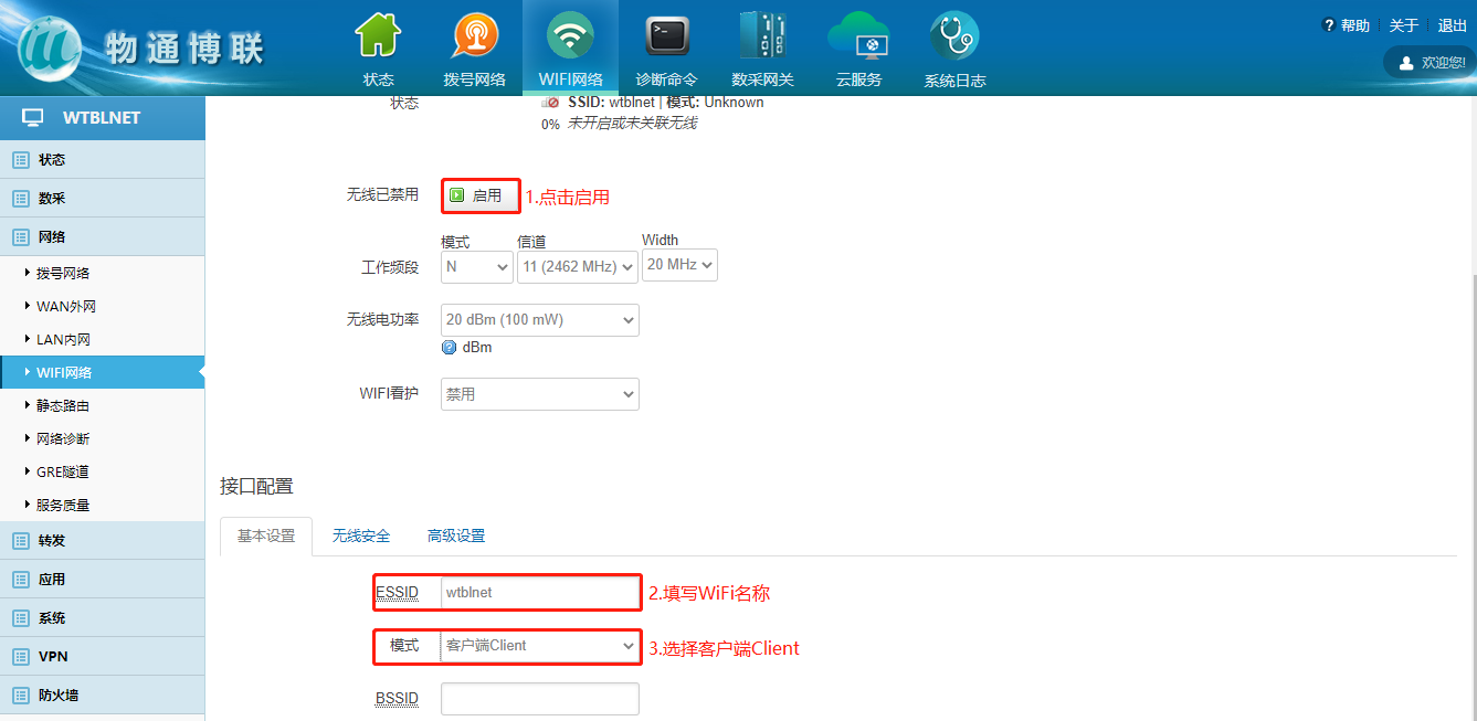 下载中心 视频中心 常见问题 售后服务 工业网关 设备快线 数据云平台 联网设备 问答百科 工业智能网关如何连接wifi热点? 时间:2022-10-26 09:15:30 点击:5550 关键词:工业智能网关,wifi 问题:工业智能网关如何连接wifi热点? 回答: (1)电脑顺利获得网线接入到网关LAN口,浏览器输入192.168.2.1默认地址 (2)登陆网关配置界面选择WiFi网络 (3)点击WiFi界面修改—进入WiFi配置界面 (4)启用WiFi—填写ESSID(WiFi名称)—模式选择客户端Client (5)点击无线安全—输入WiFi密码 注意:WiFi获取到的IP网段与网关LAN口的IP网段不能重复! 上一篇:工业智能网关如何更新程序和固件? 下一篇: 工业智能网关如何使用流量卡上网?