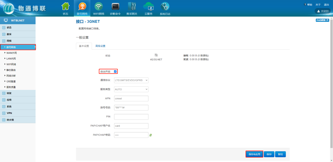 下载中心 视频中心 常见问题 售后服务 工业网关 设备快线 数据云平台 联网设备 问答百科 工业智能网关如何使用流量卡上网? 时间:2022-10-26 09:15:30 点击:5006 关键词:工业网关,流量卡,网关配置 问题:工业智能网关如何使用流量卡上网? 回答: (1)电脑顺利获得网线接入到网关LAN口,浏览器输入192.168.2.1默认地址 (2)登陆到网关配置界面,点击网络—拨号网络—自动开启—保存应用 上一篇:工业智能网关如何连接wifi热点? 下一篇: 工业智能网关如何使用网线上网?