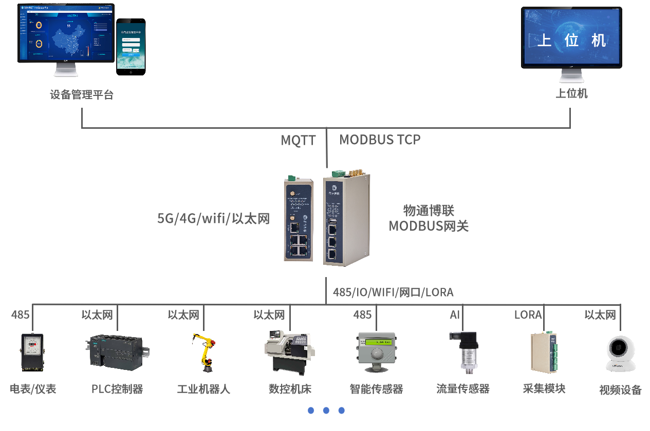 long8龙8国际Modbus网关是一款支持采集各种Modbus RTU和Modbus TCP协议设备的数据,经过网关的边缘计算和数据标准化后顺利获得MQTT协议上传到各种云平台和软件;同时支持将各种非Modbus协议的工业设备数据(如PLC、仪器仪表、传感器等)转化为Modbus 协议对接给上位机软件或者平台实现数据互通互联。