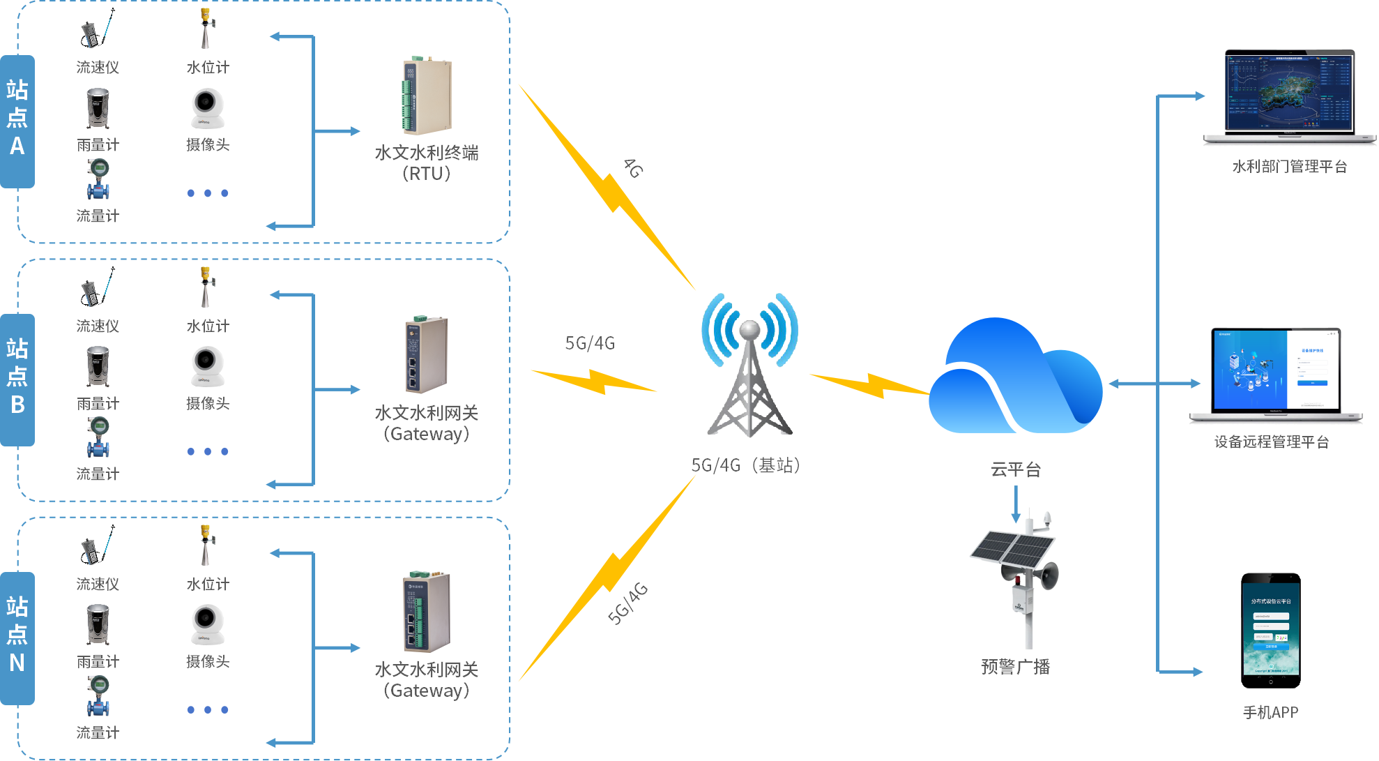 在河流各节点合理部署流量计、水位计、雨量筒、及摄像头等设备,接入long8龙8国际水文水利网关(RTU),并顺利获得5G/4G网络实时传输到水利部门管理平台,实现远程监控、自动告警、智能管理等功能,持续跟踪中小河流中的雨水情数据变化并为制定防洪救灾措施给予可靠数据支持,借助数据报表与曲线图评估出现洪水灾害的概率与危险程度,宏观调控流域水资源的配置,避免洪涝灾害的发生。