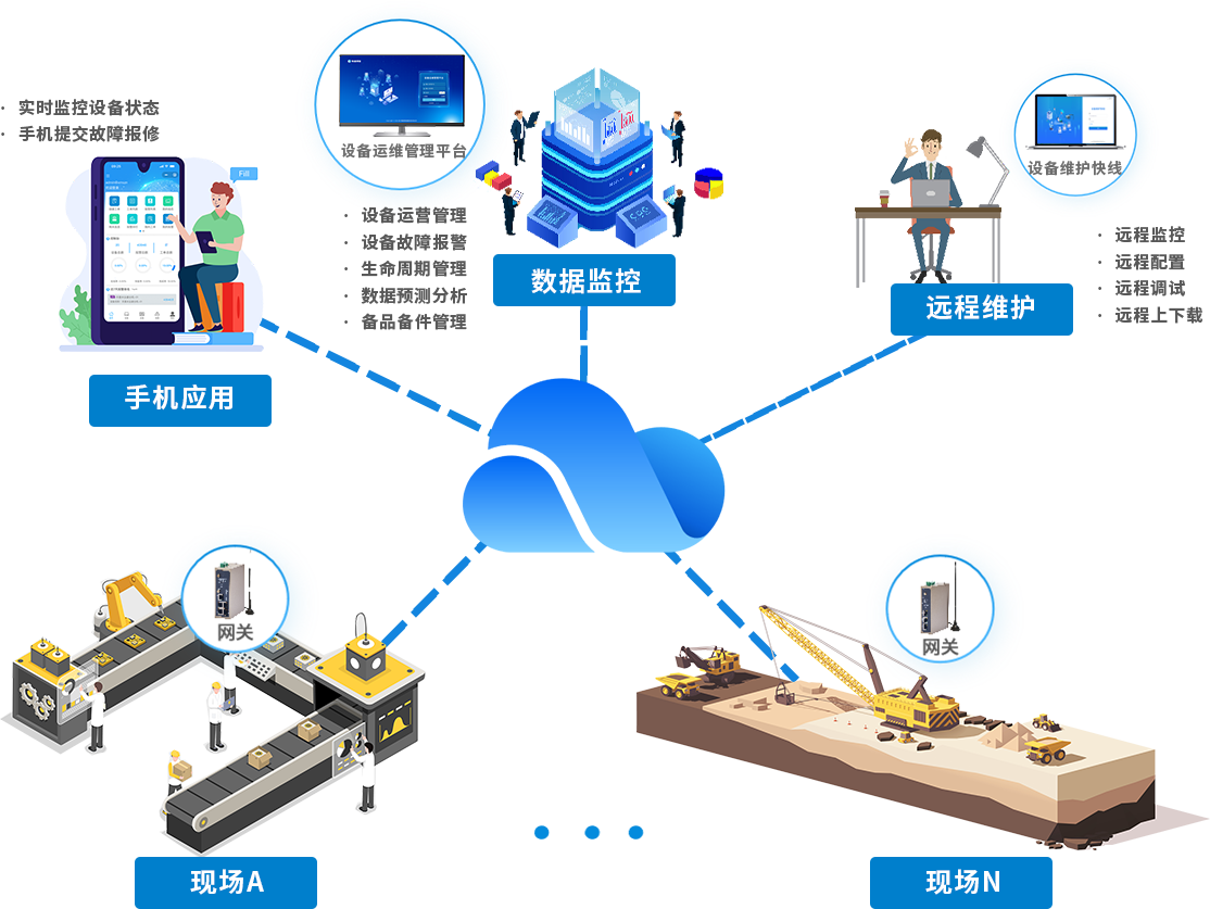 long8龙8国际针对设备制造商的装备数字化需求,构建了“终端数据采集-多网融合传输-云端智能运维-远程协同服务”的全周期技术解决方案:以工业智能网关为核心,采集装备运行参数、运行状态等数据,顺利获得 5G/4G/WiFi/ 以太网等方式将标准化数据实时上传至设备运维管理平台。平台借大数据分析与故障诊断算法,实现数据监控、趋势预测与异常识别,设备存故障风险时自动触发预警。依托设备维护快线,可远程完成程序上下载、参数调试等操作,提升维护效率、降低运维成本,助力设备制造商实现装备全生命周期数字化管理。