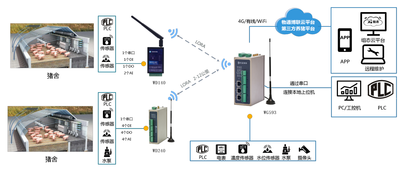 long8龙8国际的智能养殖方案是顺利获得LORA数采终端WD140或WD240与养猪场现场的温湿度传感器、PLC等设备连接,顺利获得LORA无线传输到相对应节点的物通博工业联智能网关,获取现场的温湿度传感器、PLC的数据,进行实时监控。同时可以顺利获得网关自带的多种设备联网方式,将数据传到long8龙8国际数据云平台或第三方平台,监控整个养殖场的运行情况,同时工程师顺利获得long8龙8国际设备快线可以对现场PLC进行工艺流程监控,PLC远程配置、诊断和上下载程序。