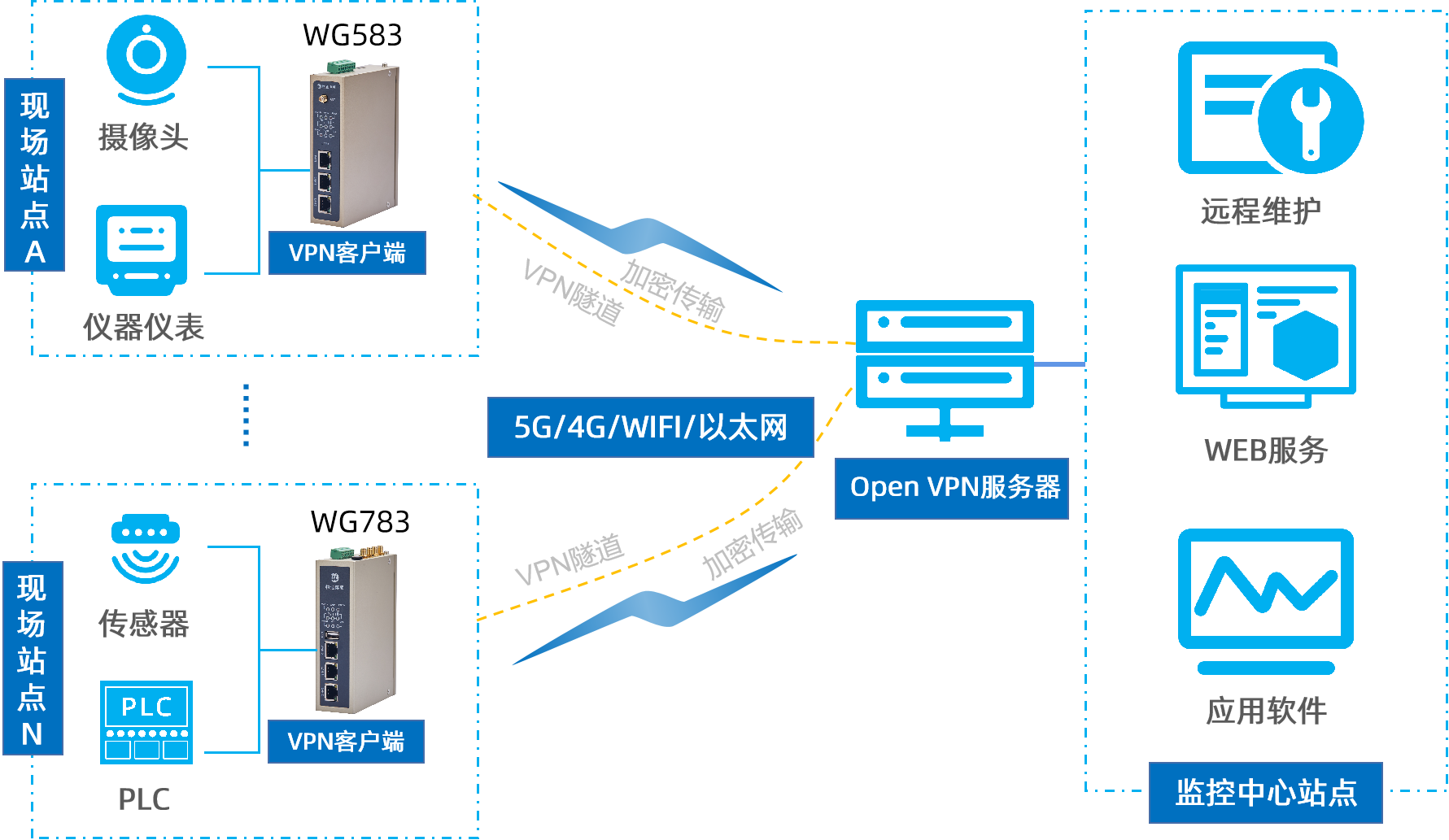 long8龙8国际OpenVPN网关顺利获得对工业现场包括PLC、仪表、传感器或者工控机等在内的设备进行实时状态、参数、故障等数据的采集,顺利获得5G/4G/ WIFI/以太网等联网方式将数据上传至服务器进行储存(顺利获得网关为VPN客户端利用OpenVPN技术在原有网络基础上建立一个加密的虚拟网络通道,实现数据加密传输,保障数据的安全性和完整性),即可在数据中心将其显示、分析,从而分析现场环境以及现场设备的相关信息参数以及运行情况,实现对现场设备的远程监控、数据分析、远程维护。