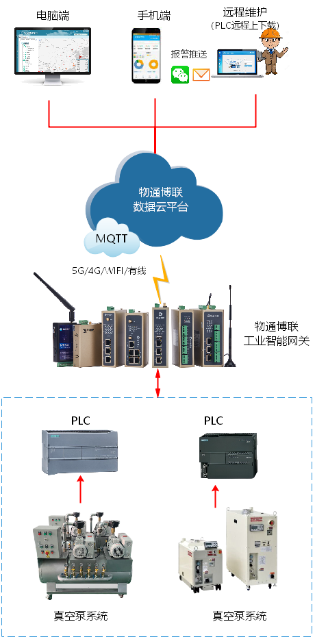 半导体工业正在逐步实现自动化生产,真空泵系统顺利获得PLC自动化控制已经得到广泛应用,因此只需要将long8龙8国际工业智能网关接入到PLC,就能实时采集PLC内真空泵的工作参数(压强、温度、振动等)并顺利获得5G/4G/WIFI/以太网等方式上传到云平台或本地上位机,进而实现设备远程监控、故障报警、远程控制及远程维护等功能。