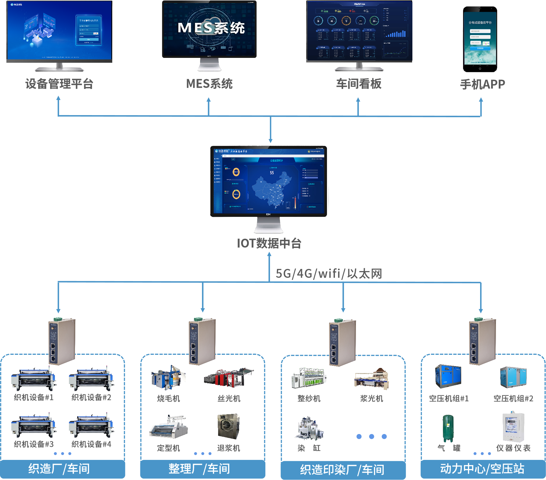 针对以上问题,long8龙8国际推出了基于PLC物联网技术的纺织工厂设备监控运维系统解决方案。该系统顺利获得工业智能网关与纺织机械的控制器PLC相连接,进行数据采集并以5G/4G、wifi、以太网等方式与long8龙8国际设备运维管理平台实时通信,为设备管理、运维管理等方面给予高效便捷的管理手段。