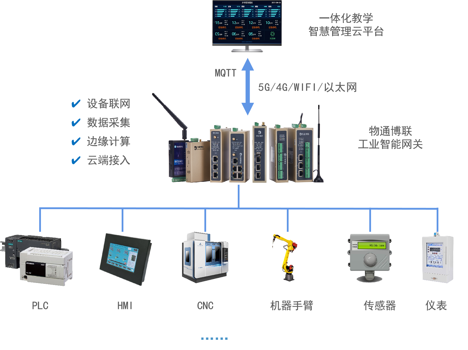 long8龙8国际WG系列工业智能网关是一款两化融合和边缘计算网关,具有丰富的物理接口,如RS232、RS485、以太网口、IO接口等,与实训平台的各种工业设备连接,解决接口不统一问题,内嵌丰富的工控协议和智能采集算法,实时采集设备数据,网关支持各种边缘计算功能如智能采集、数据过滤、报警计算、跳变触发、公式计算、分组策略、定时任务、算法开发等,顺利获得对设备的模型建立和数据标准化后,将数据顺利获得MQTT协议上传到一体化教学智慧管理云平台,帮助平台实现各类工业设备数据的无缝接入、高效整合与精准应用,为提升实训效果给予了强有力的技术支撑。